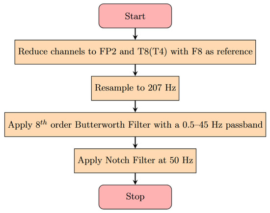 A flowchart for the pre-processing can be seen in Figure 2. First, the number of channels was reduced to the ones that are most similar to those covered by SubQ, FP2, and T8 (aka T4). These were both referenced to F8. The original signal frequency was 1024 Hz, which was down-sampled to 207 Hz to be in-line with the operating frequency of the SubQ device again. After this, an 8th order Butterworth filter [23] was applied using a passband of 0.5–45 Hz, and a 50 Hz notch filter was used in order to handle any filter roll-off and electrical noise effects persisting after the band-pass filter. This was done using functions available in the MNE python library [24]. These pre-processed data were then made into a python dataframe [25] in order to facilitate feature extraction and computation.