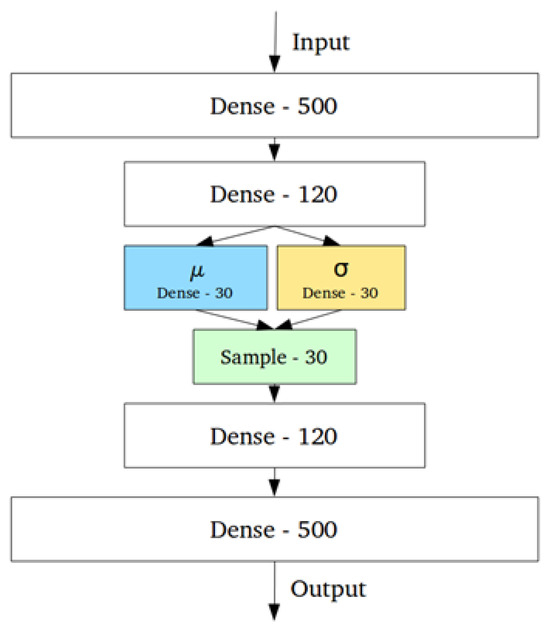 Graphical representation of a Variational Auto-Encoder. The two sets of dense layers after and before the input and output represent the encoder and decoder, respectively. and are means and standard deviations, respectively. This architecture allows for more control over the latent space of the model, and the sampling layer includes an parameter that acts as a lagrange multiplier to aid in model improvement.