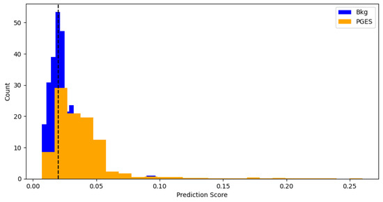 Distributions of predicted scores for background and PGES events in the validation sample. The black dashed line indicates the threshold used for anomaly detection. This threshold is found by repeated prediction-making and testing to see which strikes the best balance between precision and recall.