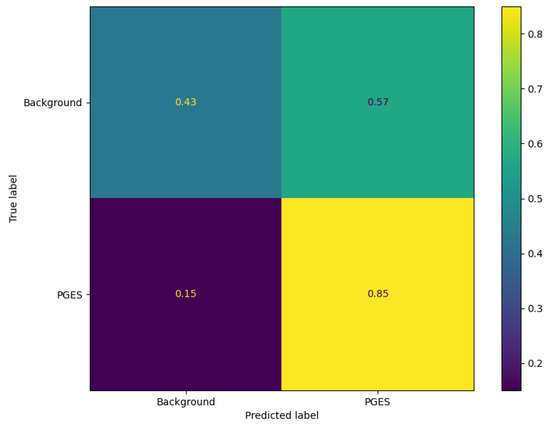 Confusion matrix for the VAE on the test dataset. We can see here that there is a high fraction of correctly identified PGES instances. Background EEG is misclassified often, shown by a higher fraction of background being predicted as PGES.