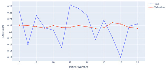Duration improvement relies on the post-processing to be more accurate. This could be achieved by having a more advanced version of the algorithm used to flip misclassified predictions. Instead of using a sliding window with majority rule, an algorithm could be trained to recognise faulty strings or misclassified predictions. This would require a corpus of data with correctly predicted, or labelled, epochs to learn from, with algorithms needing to be able to take variable length inputs. This is possible with long short-term memory (LSTM) type models that compare inputs of different lengths in order to make inferences. In general, collecting more data from those suffering from GCTSs with known instances of PGES would help to better train the algorithm, likely making it less sensitive to the variability between patient EEG responses. Investigating the number of patients used in training against the loss value achieved from the model, we can see the results in Figure 7. It is noticeable that the training loss oscillates around the validation loss, but has significant deviances from it. Also, the validation loss does not change significantly from approximately 0.22. These features indicate that the VAE frequently is prone to over- or undertraining, both problems solved by having more data. In the case of overtraining, more data reduces the risk of spurious correlations being found, giving a more general idea of PGES vs. background EEG. For undertraining, more data gives more examples to learn abstract features from. This increases the discriminating power of the VAE. Whilst it is difficult to accurately predict the number of patients that would be required to fix any such issues, studies using VAEs for datasets such as MNIST [34] use 60,000 training images [35,36], achieving accuracies in the high 90%. With the number of patients and sessions used, we have approximately 30,000 samples, just over 1000 per patient. We can then estimate that up to another 30–40 patients would be needed to achieve those results. This should be not be seen as a rigid figure, however, given that other factors will affect model performance.