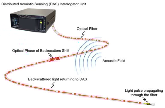 Distributed fiber-optic sensing (DFOS) has become an increasingly valuable technology for pipeline integrity monitoring [], particularly in situations where conventional methods are impractical or unavailable. These systems utilize standard telecommunication fibers connected to an interrogator unit to provide high-resolution, distributed measurements along the length of the pipeline. DFOS technologies can cover long distances, often monitoring more than 50 km of fiber [], which makes them especially suitable for remote or difficult-to-access segments of pipeline infrastructure. Unlike traditional inspection methods, DFOS enables continuous and real-time monitoring without requiring operational shutdowns. This capability supports early detection of anomalies and allows timely intervention before failures occur. Distributed Acoustic Sensing (DAS), a widely applied DFOS technique, has shown strong capability in detecting pipeline leaks by capturing acoustic and vibrational energy along the fiber [,,]. In DAS systems, coherent laser pulses are transmitted through the fiber, and phase shifts in the Rayleigh backscattered light are measured and analyzed to obtain spatially resolved strain rate data []. This method enables continuous identification of dynamic disturbances in the pipeline, including those generated by fluid leakage, with high spatial resolution (Figure 1). DAS is an effective solution for pipelines where conventional monitoring approaches cannot be applied, such as unpiggable or physically inaccessible networks.