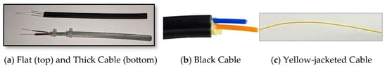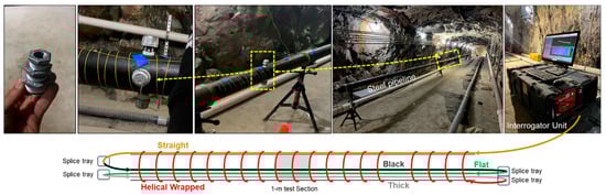 To assess the sensitivity and detection performance of different fiber optic cables, multiple single-mode optical fibers were installed along the pipeline (Figure 4). In the supported configuration, three internal cables were deployed: a black cable, a flat cable, and a thick cable resembling a wireline. The black and flat cables are standard outdoor distribution fibers. Additionally, a telecommunications-grade yellow-jacketed fiber was externally affixed in a straight configuration. A helically wrapped, yellow-jacketed fiber with 3 cm spacing was initially installed (see Figure 2) but was later excluded from the analysis due to multiple fiber breakages during the experiment that prevented data acquisition. This incident highlights the fragility of thin yellow-jacketed fibers and their potential limitations in field applications. All cables used are single-mode, standard telecommunications fibers. The black cable has a diameter of approximately 5.5 mm, the thick cable 6.0 mm, the flat cable 4.3 mm × 1.7 mm, and the yellow-jacketed fiber 0.9 mm. The internal fibers were inserted through a rubber-sealed fitting at the pipeline inlet, maintaining pressure integrity while allowing flexible movement. This setup facilitated the convenient replacement of the 1 m test section. Internal cables lay freely inside the pipe without physical attachment to the inner wall. From the interrogator, the fiber connection sequence was externally taped straight cable, then black, flat, and thick cables. Fiber splicing was performed at both ends using splicing trays, forming a continuous optical path length of approximately 220 m. In the buried configuration, the fiber deployment remained the same, except that the thick cable was omitted due to cable availability constraints following multiple splicing attempts. As a result, data from the buried configuration excludes the thick cable.