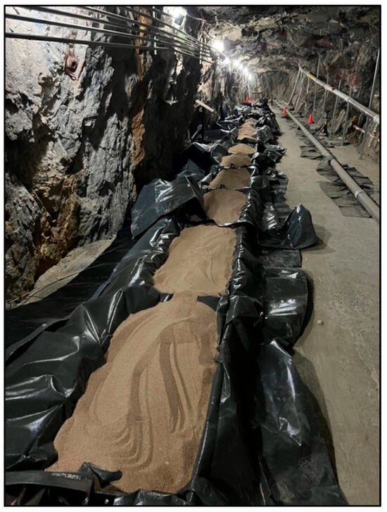 To evaluate leakage detection using DAS in a controlled environment, a steel pipeline was constructed at Edgar Mine, an experimental mine owned by Colorado School of Mines. As shown in Figure 2 and Figure 3, the pipeline is located inside a tunnel, offering a low-noise environment that minimizes ambient interference and measurement uncertainty. The facility maintains stable conditions throughout the year, with a dry atmosphere and a constant temperature of 54 °F. The experimental setup consists of a 21 m-long API 5L Grade X65 steel pipeline with a 4-inch internal diameter (Federal Steel Supply, Inc., Boston, United States). A 1 m central section was designed for leakage simulation, with 1-inch holes drilled at the top, side, and bottom to represent different leak orientations. Leak sizes were varied using galvanized malleable iron fitting reducers threaded into these holes, producing diameters of ¼”, ½”, ¾”, and 1”. Leakage experiments were conducted under two pipeline configurations: (i) a supported setup, where the pipeline was mounted on five tripods evenly distributed along its length, as shown in Figure 2; and (ii) a buried setup, where the pipeline was placed inside a series of wooden containment boxes measuring 2.44 m in length, 0.61 m in width, and 0.28 m in height, each subdivided into two equal compartments of approximately 1.22 m length. These compartments defined individual burial segments along the pipeline. A washed and graded silica sand with minimal fines was used as the burial medium, with a typical loose bulk density of approximately 1600 kg/m3. The sand was used in its as-received dry condition without added moisture. Approximately five 23 kg bags of sand were added to each compartment, providing bedding beneath the pipe and cover above it. The sand was poured and roughly leveled to ensure uniform coverage around the pipe, but it was not mechanically compacted, as shown in Figure 4.