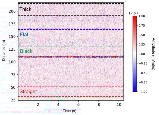 In this study, DAS data were collected using a Terra15 interrogator unit (Terra15 Technologies Pty Ltd, Perth, Australia), which captures high-frequency vibrations along the sensing fiber and allows gauge length to be assigned during post-acquisition processing []. Data were acquired with a temporal sampling frequency of 14.39 kHz and a spatial sampling interval of 0.82 m, while the interrogator operated at a pulse rate of 22.63 kHz, and a pulse length of 1.63 m. Preprocessing included converting velocity measurements to strain rate. To enhance spatial resolution, the smallest available gauge length, equal to the 0.82 m spatial step, was applied.