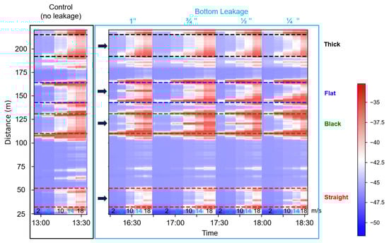 Two-dimensional spectral plots for fiber sections during bottom leakage experiments conducted at a flow velocity of 10 m/s for supported pipeline tests. The rows show data from the straight, black, flat, and thick cables, respectively. Each column corresponds to a different leakage condition, starting with the no-leakage control on the left, followed by increasing hole sizes of ¼”, ½”, ¾”, and 1”. Spectral amplitudes are presented in decibels (dB). The arrows indicate the leakage position.