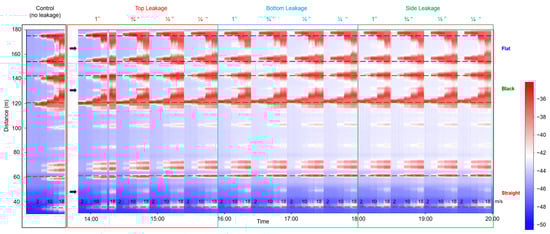 Figure 7 presents the SD data attributes for the buried pipeline, in which the same leakage conditions and flow velocities were tested as in the supported setup. In addition to the bottom leakage, the data also includes top and side leakage tests. The general trend observed in the supported configuration, that higher flow rates produce stronger vibration intensities, remains evident. However, compared to the supported case, the detection sensitivity is notably reduced in the buried pipeline, as indicated by the data from the straight and flat cables. Vibration anomalies are less pronounced, and the distinction between leakage and non-leakage conditions is less clear. This reduction in sensitivity is likely due to burial-induced damping effects, which attenuate vibration transmission and lower the amplitude of the DAS signal. These findings underscore the significant influence of pipeline installation on DAS-based leakage detection. Interestingly, the black cable still shows a strong response at the leakage point, particularly in the top and side leakage tests. However, subsequent frequency-domain analysis suggests that this response may be influenced by factors other than leakage itself. This will be discussed further in the spectrum analysis in Section 3.3.