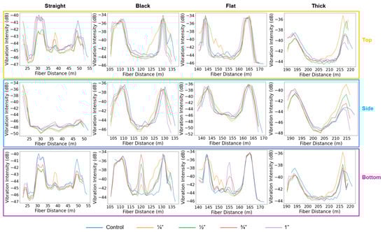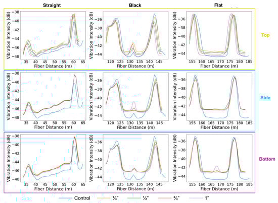 Vibration intensity profiles along the straight external (left), black (middle), and flat (right) fiber sections during the top, side, and bottom leakage experiments in the buried pipe. The different curves correspond to leakage hole sizes of ¼”, ½”, ¾”, and 1”, at a flow velocity of 10 m/s.