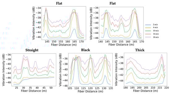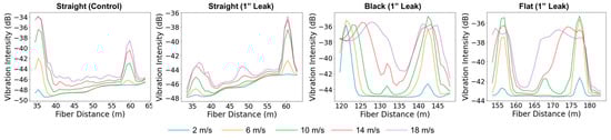 To quantify vibration anomalies at leakage points, the average vibration intensity was computed over a four-minute window during the middle of each experiment. This ensured the analysis captured a representative segment of vibration activity. The initial and final 30 s were excluded to avoid the transient period associated with flow rate adjustments. By averaging the intensity values, a distinct vibration profile was established for each fiber optic cable. These profiles were then converted into decibels (dB) to facilitate comparisons across different cables and experimental conditions.