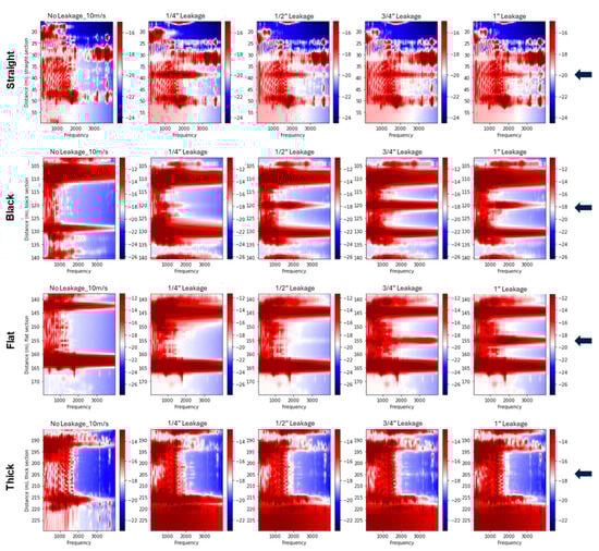 Figure 12 presents the 2D spectra for bottom-positioned leakage cases in the supported pipeline at a fixed flow velocity of 10 m/s. Across the straight, black, and flat cables, high-amplitude spectral anomalies are observed near the leakage points, as indicated by blue arrows. In contrast, the thick cable shows absent responses. Larger leak sizes produce more prominent spectral features, particularly within the 1000–2000 Hz range, where broadband energy with identifiable peak frequencies is observed. The observed spectral patterns vary with cable type, leak size, and orientation. Figure 13 shows the corresponding spectral responses in the buried configuration. In this case, leakage-related anomalies are less distinct, and the spectral energy shifts toward lower frequencies. This suggests a narrower frequency band, likely due to the damping effect introduced by sand confinement. Although the flat cable shows relatively clearer leakage signatures, overall spectral content appears attenuated compared to the supported setup. These observations are consistent with the trend of reduced leakage sensitivity previously noted in the vibration intensity profiles.