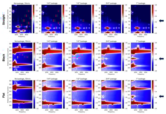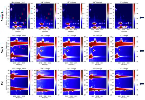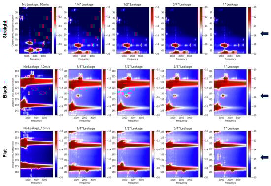 Two-dimensional spectral representations of side-positioned leaks recorded at a flow velocity of 10 m/s for buried pipeline tests. The top row presents data from the straight fiber section, the middle row shows results from the black fiber section, and the bottom row displays data from the flat fiber section. From left to right, each column corresponds to the control case (no leakage), followed by progressively larger leak sizes of ¼”, ½”, ¾”, and 1”. Spectral amplitude is expressed in decibels (dB). The arrows indicate the leakage position.