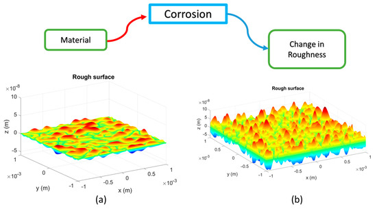 Material surface. (a) Rough surface of a sample. (b) Surface corroded. Corrosion produces changes in its topography (roughness).