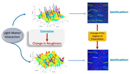 One of the immediate mechanical effects of the appearance of corrosion on the material surface is the change in roughness (Figure 1). For this reason, if a laser beam is impinged on a corroded sample, the characteristics of the speckle produced should be different compared to the speckle pattern before corrosion occurred. In other words, corrosion changes the roughness, which in turn modifies the light–matter interaction process, resulting in a change in the polarization state of the spatial fluctuations of the field (speckle) (Figure 2).