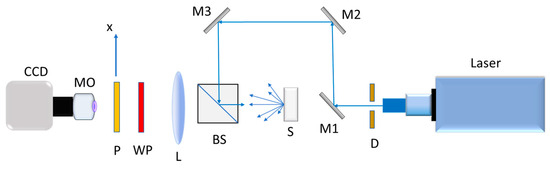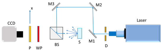 Figure 3 shows the optical assembly used to determine the degree of polarization of the radiation scattered by the samples. The system consists of an HeNe laser of 632.8 nm with an expander; a diaphragm D to control the diameter of the incident beam on the sample; mirrors M1, M2, and M3 to redirect the beam; a beam splitter BS; a λ/4 waveplate (WP); a polarizer (p); and a CCD camera. The reason for this three-mirror structure is the operational versatility of the optical device to also work in transmission for experiments with translucent samples (this is not our case), achieved simply by eliminating mirror M1. This arrangement allows us to illuminate the sample perpendicularly and to collect the diffracted radiation data with a camera. The distance also between the material and the detector was chosen so that the speckle size recorded was larger than the CCD pixel extent.