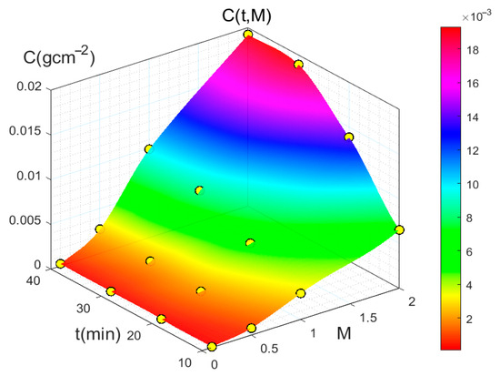 The results obtained for the samples subjected to corrosion are shown in Figure 6 (see Section 2.1). The first graph presents the values of the mass loss per unit area associated with corrosion, as a function of the time that the sample remains exposed to the acid for different molarities (C = C (t, M)). As expected, it shows an increase in the degree of corrosion as the molarity and the time increase.