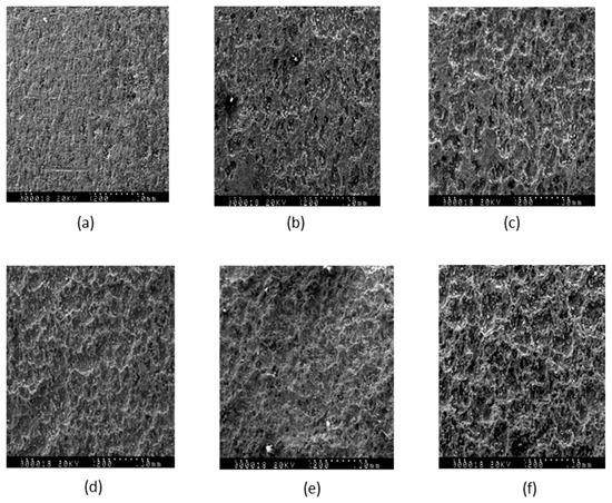 In order to corroborate that the accelerated corrosion was of a generalized type, a surface study was carried out using SEM microscopy. The results obtained for the samples above are shown in Figure 7: Figure 7a shows the initial sample without corrosion. In Figure 7b, a change in the surface due to exposure to acid can be observed. In Figure 7c, a notable change in the surface structure may be seen. Finally, in Figure 7d–f, an increase in roughness can be observed between them, although not as pronounced as in the first three.