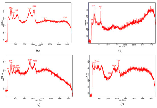 The first picture (a) shows the Raman shift in the initial sample without corrosion. As can be seen, there are various peaks in the spectrum (219, 292, 663, 1336, and 1562 cm−1) that are compatible with the existence of Fe2O3. This could indicate that, although this initial sample was not exposed to the artificial corrosion process in the laboratory, the steel itself already had oxidized zones, which can be due to multiple causes related to the interaction of the material with the external environment, including its manufacturing process. This reveals that the appearance of rust is common in this type of material, which is easily attacked by substances present in the environment (dust, contaminants, humidity, etc.). Figure 8b shows the results for the first sample attacked by the solution (see Figure 7b). Figure 8c corresponds to specimen M2, for which almost the same intensity peaks are observed, although one new peak appears around 400 cm−1. This value is not usually associated with individual elements per se, but rather to compounds or phases that contain certain elements. For this reason, it is difficult to be sure exactly to which substance it refers. There are different possibilities; however, in our case, as the samples comprise steel, the peak probably corresponds to iron oxides and hydroxides, since these components occupy a band of the spectrum that contains this value. In Figure 8d the spectrum is again similar to the previous ones, with more noise overlapping some small peaks. Finally, in Figure 8e,f, the same general behavior as in the previous figures is observed. More numerical values appear on the graphs, which are the data processing results; these are irrelevant to the present study. It should also be mentioned that in all the pictures, a wide continuous spectrum appears from 1700 cm−1. This is a very wide range in which mainly molecular or surface-bound groups are detected, but not elemental vibrations. These molecular features indicate the presence or involvement of certain elements or functional groups. In particular, the final part between 3200 and 3600 cm−1 could show the presence of water, hydroxyls, or carboxylic acids.