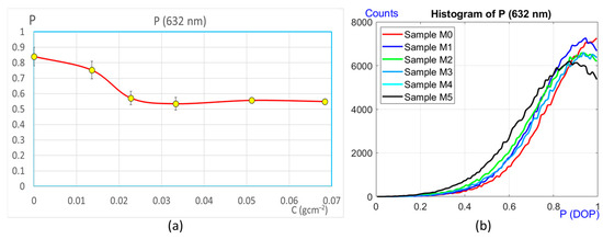 The graph in Figure 9a shows the degree of polarization (DOP) as a function of corrosion for each of the samples. These results clearly show how the polarization of the scattered light varies as the corrosion increases. It is observed that in the first stages of the corrosion process analyzed (samples M0, M1, M2, and M3), the polarization changes in a very appreciable way. However, thereafter, the degree of polarization undergoes small variations, and the relationship between the two quantities p and C cannot be clearly correlated. It follows that this device (far field), with this wavelength, allows us to study the corrosive process of the samples in the initial stages (Figure 7a–d). Subsequently, the DOP fluctuates around the same value, making it difficult to correlate it well with corrosion, i.e., relative variations in the DOP cannot be reliably distinguished. However, another DOP study can be performed parallel to the previous one, which could provide information not obtained with the previous analysis. To do so, it must be considered that the calculation of the DOP performed is a global analysis of the polarization. In other words, what has been done is the average DOP measurement of the speckle pattern contained in the whole detector. The idea now is different. It involves obtaining the DOP at each point of the image (pixel), calculating its histogram, and relating it to the degree of corrosion. In other words, the DOP is calculated point by point..