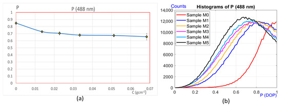 Experimental results with λ = 488 nm. (a) Degree of polarization (DOP) versus corrosion. (b) Histograms corresponding to the DOP, point by point.