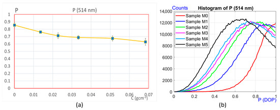 With the optical layout described above (Figure 5), measurements were taken using a monochromatic radiation of λ = 514 nm, and the results are shown in Figure 11. The behavior of the degree of polarization p is again similar in structure to the previous one, but with other values and without ambiguity in any of them, i.e., each global DOP corresponds to a single point of corrosion in the graphic. Even though the differences in the DOP are appreciable over the entire range studied, p was also analyzed for each image point, the result of which is depicted in Figure 11b. The histograms obtained are remarkably different from each other. Note that they also follow a sequence clearly correlated with the corrosion. In the same way as for 488 nm, this is important because this 514 nm radiation also allows us to study corrosion without ambiguity over the target range.