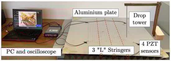 To generate the impact signal database, several experimental campaigns were conducted using a drop tower, simulating different scenarios for aircraft wing/fuselage bottom panels. The perpendicular impacts were generated by dropping a 10 g steel ball with a diameter of 5 mm. Since the drop-tower pipe had a diameter of 10 mm, in the worst scenario the maximum random deviation of the experimentally produced impact position would be 2.5 mm, which is manageable by the algorithms previously developed in [,].