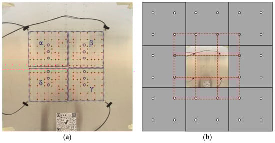 Plate scenarios: (a) 167 impacts (red circles), removed rivets (blue circles) and 4 quadrants (dotted blue squares); (b) “plate assembly” with no corners outside the sensor array. The red dotted lines identify the working area depicted in (a).