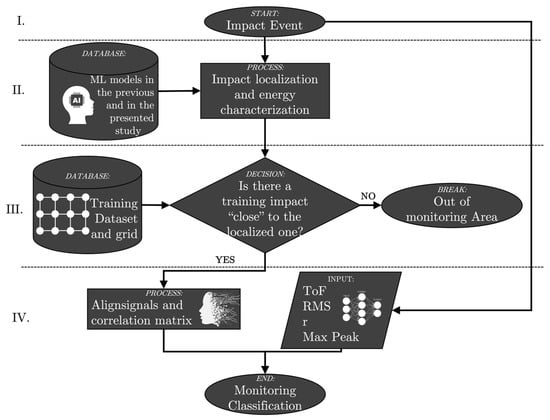 The working principles of the presented technique of “passive monitoring” using environmental vibrations due to impacts can be represented by the following flow chart (see Figure 3).