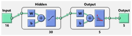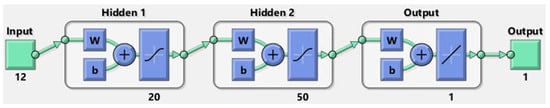 Moreover, in these problems the main specification was to tolerate long computing times and high resource consumption to obtain precise results. For this reason, the Bayesian Regularization training algorithm was chosen because of its greater accuracy compared to the other main methods, such as Levenberg–Marquardt Backpropagation and Scaled Conjugate Gradient Descent. The process called Bayesian [] provides a network training function that updates the weight and bias values according to Levenberg–Marquardt optimization. It minimizes a combination of squared errors and weights and then determines the correct combination to produce a network that is able to generalize well. Another specification is the generalization of models, which allows them to obtain the best predictions over test data without excessive correlation with training ones. The choice of a k-fold cross-validation procedure, considering 5 different combinations of training/test sets with a training/test ratio of 70/30 allowed such fitting.