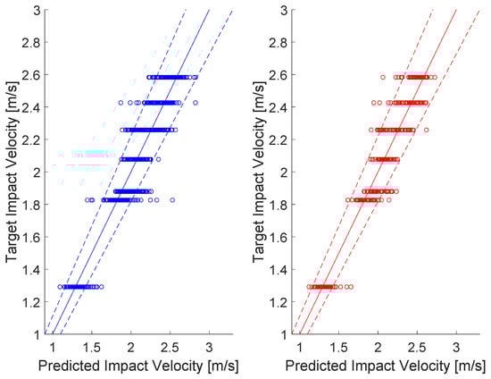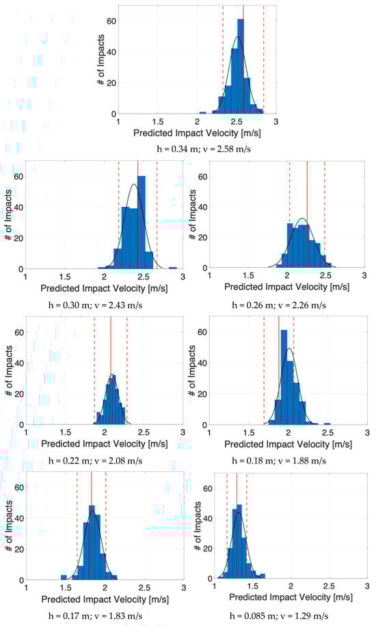 More detailed results can be analyzed by following Figure 7, which shows the distributions of predicted impact velocities for each dropping ball height (i.e., target impact velocities).