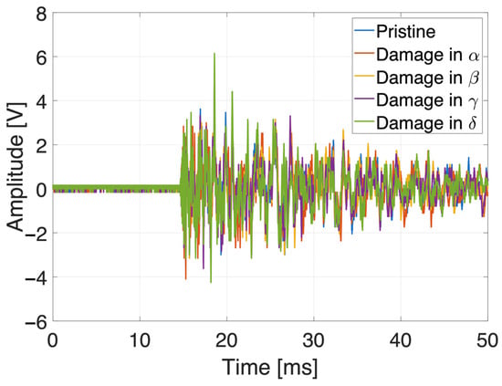 It is noteworthy that the monitoring scenario can be represented as a pattern recognition one, in which inputs are classified according to target classes. As an example, the impact occurred in one of the tested positions recorded by the same sensor is reported in Figure 8 as time histories—one for each damaged quadrant. In the time domain, the signal differences are so small, and the features evaluated (four ToFs, four peaks, four RMSs and four correlation coefficients per impact input) were necessary to correctly train the chosen algorithm.