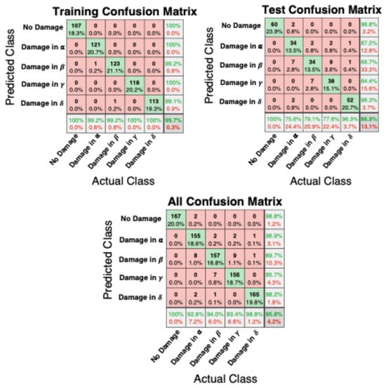 Training, testing and all confusion matrices. The five damage classes considered are reported on both axes of each matrix. Green cells on the diagonal indicate the correct predictions, red cells the wrong ones.