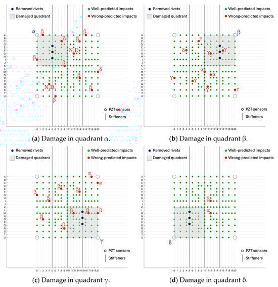 Figure 11 shows the distribution of false positives for each damage scenario: the green circles represent the impacts that well predict the damaged area, while the red ones indicate wrong predicted impacts (the relative red Greek letters specify the wrong predictions). The worst result was obtained for the prediction of damages in quadrant β (see the predicted row test class “Damage in β” in Figure 10 and the β red circles in Figure 11): since the artificial damage was caused by manually unriveting the stiffener, probably, this less accurate result was a consequence of a more complex kissing bond in the quadrant β case.