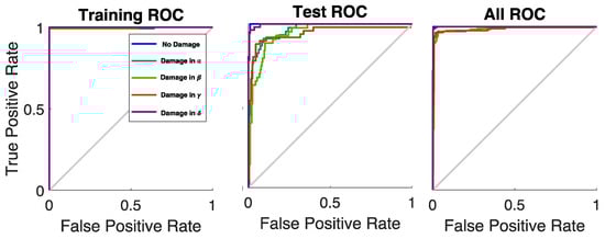 Eventually, the relative ROC (Receiver Operating Characteristic) curves and the True-Positive Rates (TPRs) vs. the False-Positive Rate (FPRs) were provided as functions of the five investigation classes (one pristine and four damaged plates). The training ROCs were close to the point in the upper-left corner of the space, representing about 100% sensitivity (equal to the True-Positive Rate) and 100% specificity (equal to 1–the False-Positive Rate), with just two false negatives in the training phase. It is noteworthy to highlight, also, that the test ROCs were all far above the diagonal line (the so-called “line of no-discrimination” from the bottom-left to the top-right corners of the space). The overall (training + test) ROCs can be used to measure the accuracy of the presented technique: the Areas Under the Curve (AUCs) were always bigger than 0.9 (AUCN.D. = 0.99, AUCα = 0.98, AUCβ = 0.97, AUCγ = 0.99, AUCδ = 0.99), as shown in Figure 12, certifying the excellent developed classification method and the resulting outstanding passive monitoring technique.