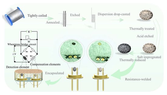 The detection and compensation elements are interconnected via a Wheatstone bridge circuit. Surface Pd catalysts on the detection element drive exothermic methane combustion, converting chemical signals (CH4 concentration) into thermal energy. Through thermal conduction, this elevates the platinum wire’s temperature, increasing its resistance to generate electrical signals. Methane concentration quantification is achieved by measuring the resultant potential difference across the bridge. The fabrication workflow and structural configuration are illustrated in Figure 1.