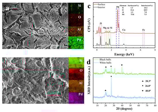 (a) Surface morphology (SEM) and corresponding EDS elemental mapping (Si, O, Al, and Pd) of the black bead; (b) internal morphology (SEM) and corresponding EDS elemental mapping (Si, O, Al, and Pd) of the black bead; (c) comparative EDS spectra of black bead surface vs. interior; and (d) XRD patterns of black and white beads.
