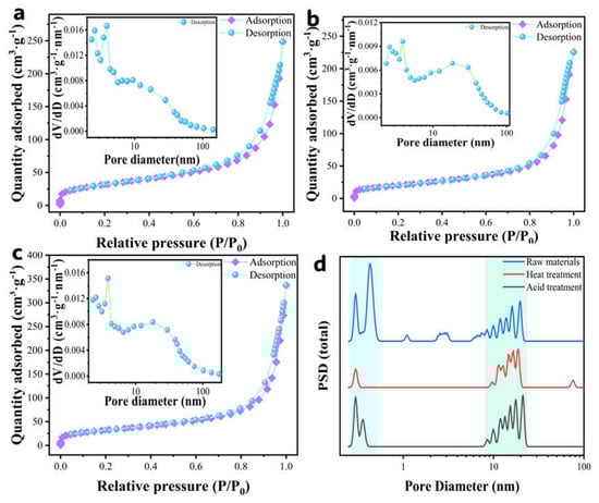 Nitrogen adsorption curve and pore distribution of white sphere (a) raw material; (b) heat treatment; (c) acid treatment; and (d) pore volume distribution.
