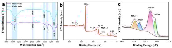 (a) FTIR spectra of black and white beads; (b) XPS full spectrum of the black bead surface; and (c) high-resolution Pd 3d scan of the black bead surface.