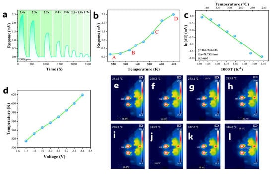 (a) Differential response vs. operating voltage at 2000 ppm CH4; (b) differential response vs. operating temperature; (c) Arrhenius fitting of temperature-dependent response; (d) sensor surface temperature vs. operating voltage; and (e–l) thermal imaging at operating voltages (1.7–2.4 V).