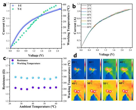 (a) The voltage–current/working temperature relationship for the detection element (black bead) measured at 25 °C (ambient temperature); (b) the voltage–current relationship for the detection element (black bead) measured under varying ambient temperature (25–60 °C); and (c,d) the resistance and working temperature of the detection element (black bead) under the stable voltage (1.05 V) across ambient temperatures range from 25 to 60 °C.