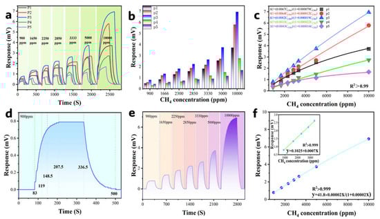 P3’s dynamic response across 900–10,000 ppm CH4 (Figure 7d) demonstrated a maximum ΔU of 0.8 mV at 900 ppm with rapid kinetics: response time τres = 65.5 s (T90 = 65.5 s, T70 = 36 s, T90/T70 ≈ 1.8, Equation (4)) and recovery time τrecov = 163.5 s. Response–recovery profiling (Figure 7e) and fitting analysis (Figure 7f) further revealed the following: low-concentration linear sensitivity = 0.7 µV·ppm−1 (Equation (5)), Langmuir-modeled maximum response = 41.8 mV, and the detection limit LOD = 36.14 ppm (3σ noise = 0.03 mV, Equation (6)), which is significantly below methane’s explosion threshold (1% LEL = 50 ppm), thus ensuring reliable early-warning capability.