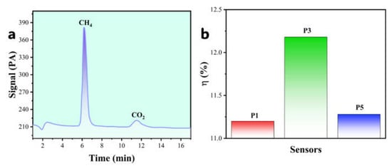 Figure 8a presents a representative gas chromatography (GC) analysis of exhaust gases from the sensor chamber for the P3 sample. Distinct CH4 and CO2 peaks confirm catalytic methane oxidation. Catalytic efficiency (η) was calculated from their GC peak area ratio (Figure 8a, Equation (9)):