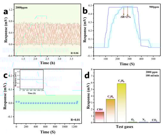 Selectivity is a crucial indicator for sensors to achieve reliable detection in complex atmospheric environments. To this end, we selected various interfering gases, including CH4, C2H6, C3H8, O2, N2, and CO2, to evaluate the sensor’s selectivity under identical temperature and humidity conditions, measuring its response values to each gas type (Figure 9d). The test results demonstrate that the sensor exhibits a significantly higher response to alkane gases (CH4, C2H6, and C3H8) compared to other gases commonly present in atmospheric environments. This differential response among the alkanes arises from variations in their catalytic combustion characteristics, particularly the catalytic ignition temperature and associated heat release. These findings confirm the sensor’s excellent repeatability and specificity for methane and other alkane gases, highlighting its potential utility in various gas sensing applications.