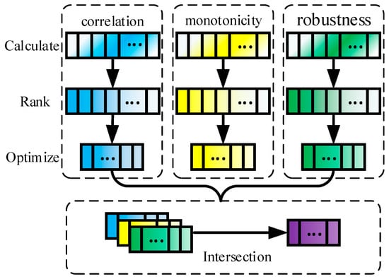 - Calculate the correlation, monotonicity, and robustness indexes of each feature, Equations (1)–(3), and evaluate the features according to different indexes to obtain the set of features with better performance in correlation , the set of features with better performance in monotonicity , and the set of features with better performance in robustness , and then find the intersection of the sets to obtain the initial set of features .