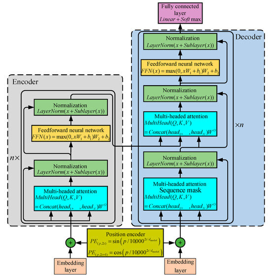Transformer is a network model based on the attention mechanism [27], which breaks through the limitation that recurrent neural networks cannot compute in parallel by using methods such as multi-headed attention mechanism and positional encoding embedding, and effectively solves the problem that recurrent neural networks are ineffective in processing long-order data and convolutional neural networks are too computationally intensive in processing long-order data. Figure 3 illustrates the structure of a typical Transformer model.