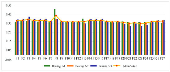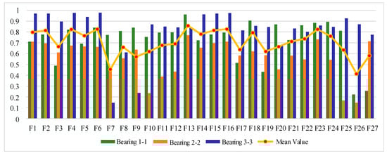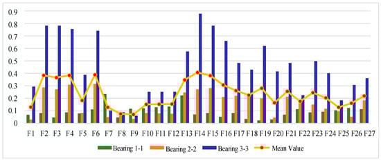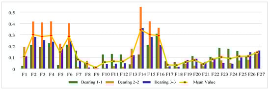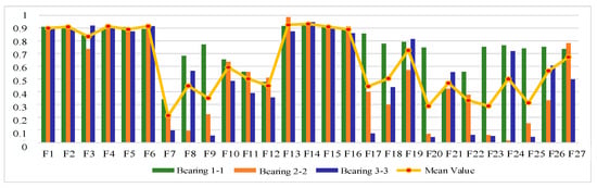 According to Figure 18, the robustness indexes vary less among bearings and features. The results of the ranking of the robustness evaluation index scores for each feature are shown in Table 14. The top 50% of features after sorting are taken as the optimal feature set, so is defined as follows: