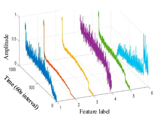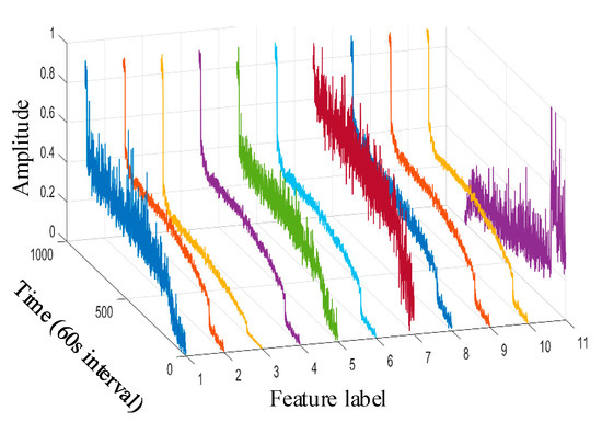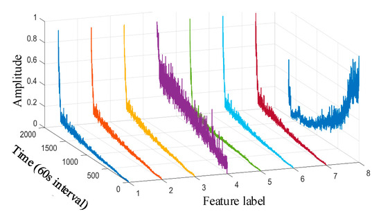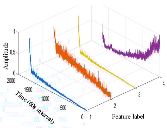 The clustering result is shown in Figure 20. At the same time, there is only one cluster in cluster ; i.e., there is only one feature, so the only feature is selected as the representative feature of this cluster. Cluster has more than one cluster; i.e., there are multiple features, so the feature with the largest relevance index is selected as the representative feature. By clustering and selecting, the final redundant features are , and the feature curves are shown in Figure 21.
