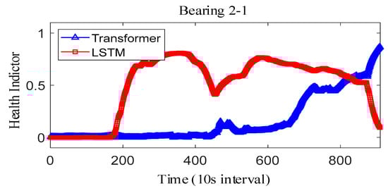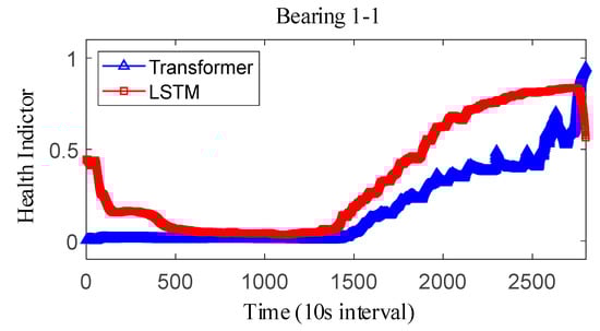 The proposed Transformer attention mechanism model-based bearing health indicator construction method is experimentally validated by IEEE PHM 2012 bearing the full life cycle dataset and XJTU-SY bearing the full life cycle dataset. According to the experimental results, it can be found that the Transformer attention mechanism model-based bearing health indicator construction method has good performance in both the health index curve obtained has an obvious trend of increasing with time, which reflects the good characterization ability of the health index on the degradation degree of the bearing. Compared with the LSTM model, the health indicators obtained from the Transformer model have better performance in terms of correlation, monotonicity, and robustness, indicating that the Transformer model based on the multi-head attention mechanism is more effective in learning the key information in the multidimensional features and mapping the multidimensional information to the health indicators to characterize the degradation degree of the bearings.