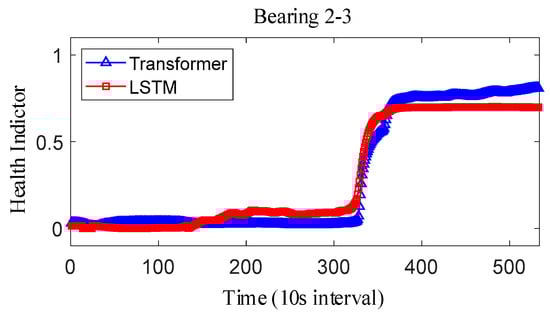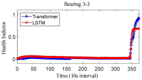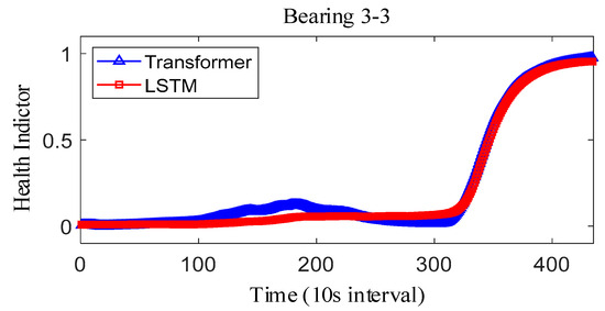 The correlation, monotonicity, and robustness index values of the health indicators for bearings 1-3, bearings 2-3, and bearings 3-3 are shown in Table 15. The health indicators obtained based on the Transformer model perform better than those obtained based on the LSTM model in terms of correlation, monotonicity, and robustness in general, which also verifies that the health indicators based on the Transformer model. This also verifies that the Transformer model-based health indicators have more performance advantages than the current LSTM model-based health indicator construction methods. Meanwhile, the proposed method is further compared with PCA and KPCA methods. The results of PCA and KPCA are still robust, but the correlation and monotonicity are not as good as those of the proposed method. Therefore, the proposed method has advantages over other feature level fusion methods.