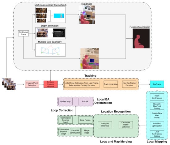 Moving objects pose a significant challenge to SLAM systems, leading to a decline in both positioning accuracy and the integrity of map construction. This issue is mainly attributed to artifacts present in the static map representation, which are introduced during the processes of feature extraction and matching in SLAM. In pursuit of this objective, we have introduced an OS-SLAM system derived from ORB-SLAM3, designed to maintain stability in a stationary setting. The schematic representation of this process is depicted in Figure 1. Our approach involves the integration of the Rigidmask [] and YOLO-fastest [] post-motion segmentation frameworks into ORB-SLAM3 to enhance optical flow estimation networks. Specifically, Rigidmask is utilized for dynamic motion object estimation and segmentation in conjunction with YOLO-fastest prior to feeding the image into the tracking module. Within the motion segmentation module responsible for identifying moving objects, we have enhanced the optical flow estimation network by incorporating multi-scale refinements to enhance the accuracy of small object motion. Simultaneously, we have optimized the update module and loss function to address computational expenses associated with multi-scale processing, thereby achieving precise reconstruction of static point cloud maps.