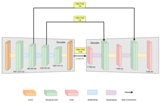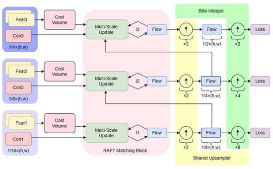 Multi-scale image input and feature extraction are implemented by integrating ResNet residual units into the original RAFT encoder structure, following a U-Net-like architecture. This approach preserves hierarchical feature representation while enhancing the encoder’s capacity through residual connections. As shown in Figure 3, the input RGB frame is initially converted from 3 to 64 channels, then progressively downsampled via residual units to generate multi-scale intermediate features at resolutions of , , and . These features are fed into the enhancement module, where upsampling begins from the deepest features to maintain dimensional consistency during residual summation. This hierarchical design ensures feature alignment across scales while preserving spatial coherence. Finally, the intermediate features (inter-Feat) from the current shallower scale are fused with upsampled deeper features through residual units. This fused output undergoes iterative upsampling and residual summation to propagate features toward shallower scales, thereby preserving deeper-scale features (Feat) throughout the iteration process. The multiscale contextual features share the same feature extractor structure as the base framework.